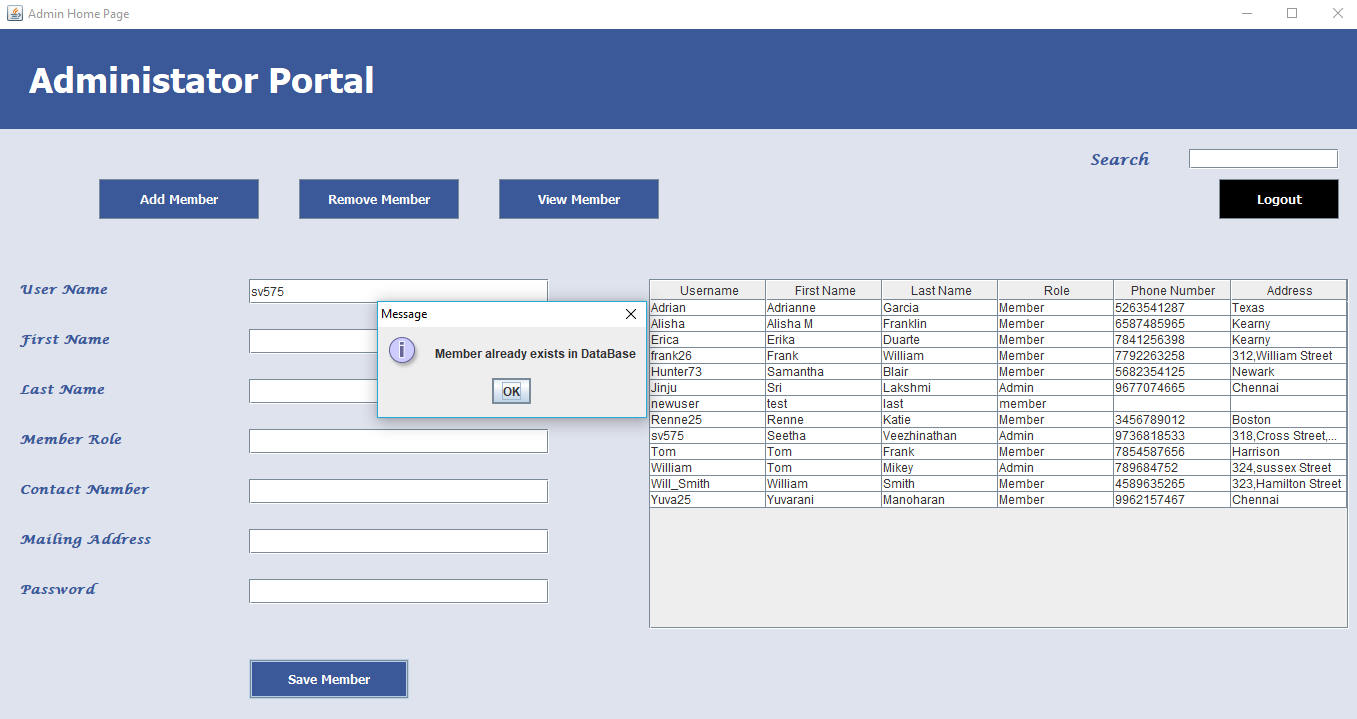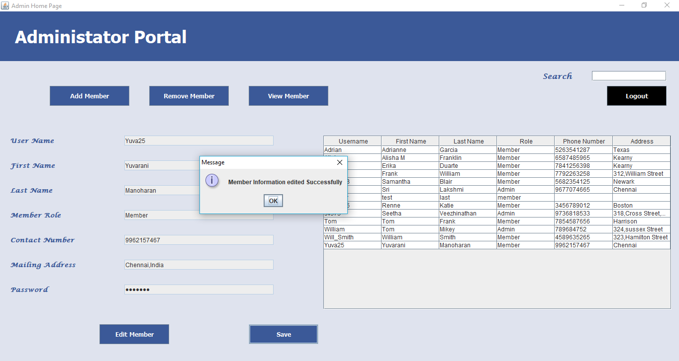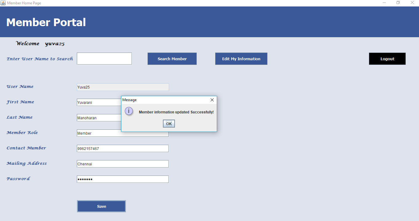 The Online Membership Contact System is Java Swing based Portal created for Updating and maintaining the Member information. There are two modules in this application which are Role specific for Administrator User and the Member. The entire application is based on the client-server architecture where the all client request are handled by the server.